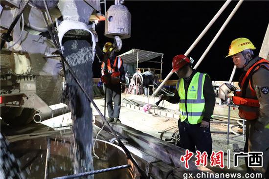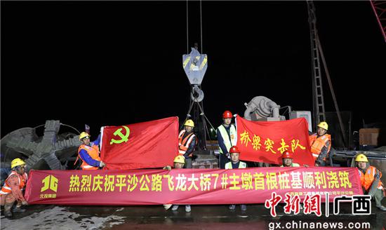 中新网广西新闻11月11日电(廖永腾)广西路建集团11日介绍,11月9日晚,历经3小时紧张施工,广西北投集团直属企业广西路建集团S210横县平马至灵山沙坪公路项目(简称“平沙公路项目”)飞龙大桥7#主墩首根桩基顺利浇筑,标志着飞龙大桥主墩桩基施工全面铺开。