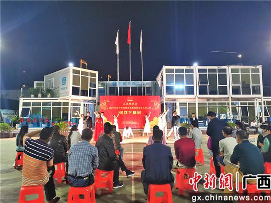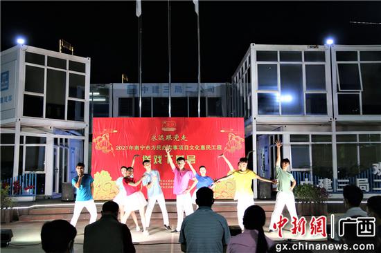中新网广西新闻11月16日电(万思佳 李美玲)日前,中建三局二公司中新南宁国际物流园项目大门口人头攒动,“永远跟党走”2021年南宁市为民办实事文化惠民工程“送戏下基层”演出活动正在这里上演,吸引了项目众多职工和工友前来观看,现场不时响起阵阵掌声和欢笑声。