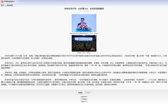 摘要提示:全國台灣同胞投資企業聯誼會會長李政宏10月31日在第19屆桂台經貿文化合作論壇上接受中評社記者採訪時表示,大陸是全球唯一最大的單一市場,發展潛力巨大。台商要吃透政策,未來的發展方向在哪裡,商人的腳步一定要踩在哪裡。