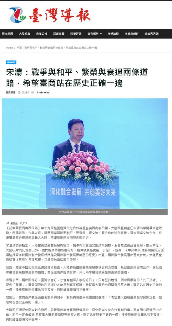 - 台湾导报:宋濤:戰爭與和平、繁榮與衰退兩條道路,希望臺商站在歷史正確一邊