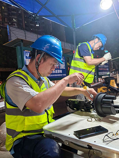 中国电信钦州分公司施工人员加班加强完成线路迁改工作。广西电信供图