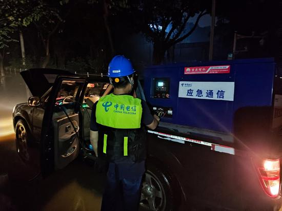 6月19日14时30分,洪水开始漫入桂林高新七星区东城路。高新七星区分公司立即组织人员在地下室油机房配电房等机房门口堆放防洪沙袋,并接好机动水泵。18时,七星片区市电已停,五个水泵抽水不及,地下室水位过肩,油机无法使用,七星区分公司紧急启动蓄电池供电。蓄电池供电时长有限,一旦机房停止运转,辖区数万手机用户的通信将受到影响。面对险情,中国电信广西公司连夜紧急调集应急移动发电机,在交通中断无法靠近机房的情况下,采取布放临时电缆的方式解决了供电问题,确保了用户通信。