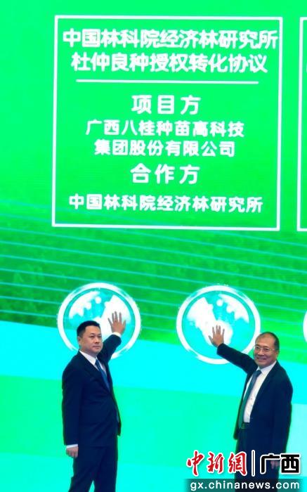 中新网广西新闻11月23日电 (徐康铭)11月22日,在2025年世界林木业大会上,中国林科院经济林研究所与广西八桂种苗高科技集团股份有限公司(简称“广西八桂种苗集团”)正式签署杜仲良种授权及科技合作协议。