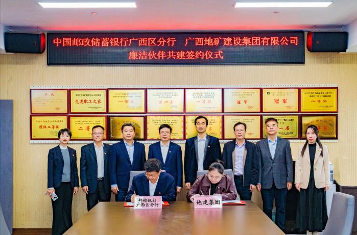 为深入推进清廉金融文化建设,推动廉洁共建与业务发展深度融合,近日,邮储银行广西区分行与广西地矿建设集团有限公司(以下简称“地建集团”)举行“廉洁伙伴共建”签约仪式。双方共商廉洁合作大计,共绘互利共赢蓝图。