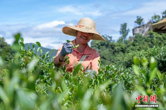 近日,广西梧州市苍梧县六堡镇黑石村有机茶园迎来秋茶采摘高峰。茶农们趁着晴好天气,忙碌采摘新鲜秋茶并供应市场。