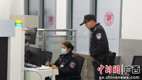 图为民警韦杰修在安检区检查违禁物品。邓开盛摄