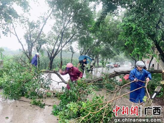 干部群众清理路面树枝。玉州区融媒体中心供图