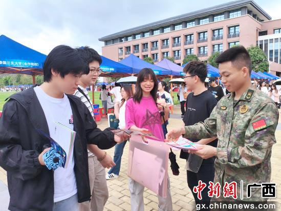 中新网广西新闻7月4日电(陆云龙)近日,为激发辖区高校大学毕业生的参军入伍热情,南宁市武鸣区征兵办结合辖区高校双选会,开展2025年秋季征兵宣传进高校活动。