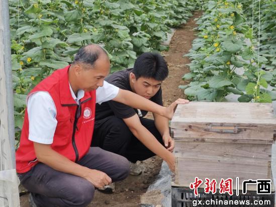 中新网广西新闻7月9日电(李宛婷 陈迈)“蜜蜂授粉能让甜瓜结出的果实品质更佳。”清晨7点,广西铁山港设施蔬菜科技小院首席专家唐小付一边观察蜜蜂外出授粉情况一边说。在平陆运河马道枢纽的甜瓜大棚里,他和学生们已开始新一天的试验与劳作。