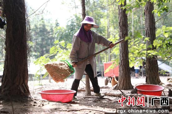在树林下的鸡舍旁,基地工人韦美华正麻利地给鸡群喂食、添水,呼唤几声后,林下的土鸡便蜂拥围拢过来,争先恐后抢夺饲料。“我在这儿上班4年,每月能挣3000元工资,离家就几里地,既能照顾家里老人孩子,又能挣份稳定收入,比出去打工强多了。”韦美华说,她每天的工作从清晨开始,上午给鸡群添饲料、换饮水,下午就打扫鸡舍、收鸡蛋,工作很充实。