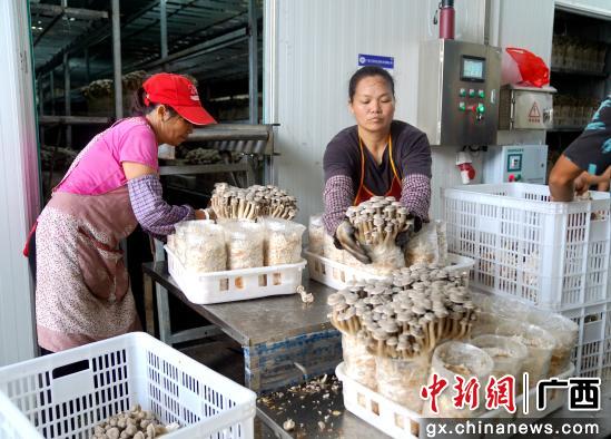 中新网广西新闻7月30日电(苏蕊花 谢海兵 覃创锐)近日,走进位于广西贵港市港北区根竹镇幸福社区菌菇生产基地的食用菌包装车间,只见一簇簇形似鹿茸、色泽温润的鹿茸菇簇拥生长,饱满喜人。传送带上,新鲜采收的鹿茸菇正被运送至加工区,工人们有条不紊地进行切割、分拣、打包,送入烘干房制成干货。