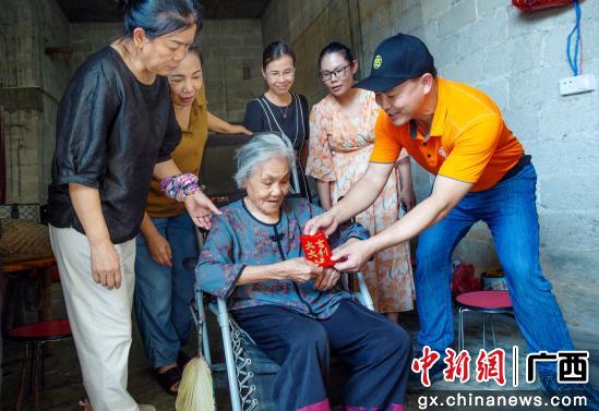 中新网广西新闻7月30日电(蓝洲)7月27日,广西上林县在邕(南宁市)创业、就业爱心人士代表一行6人专程返乡,亲切看望了明亮镇溯浪4名百岁老人,献上祝福及慰问品慰问金,延续自2020年来就发起的关爱百岁老人爱心行动。