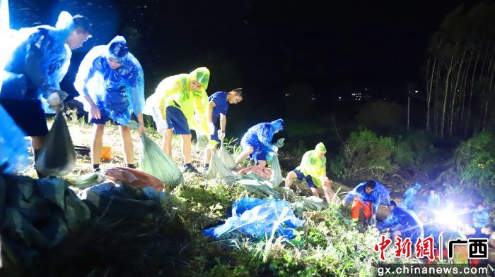10月2日,瓦塘镇干部在排查新平堤中发现防洪堤渗水点,上报险情后,区防汛抗旱指挥部立即派驻前线指挥部,集结党员干部、应急、消防、贵港蓝天救援队、飞鹰救护等抢险救援队伍,在水利专家的指导下采用“围井反滤”技术进行处置,渗水风险点得到有效控制。