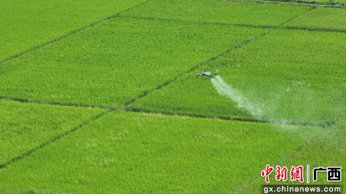 中新网广西新闻10月14日电 (宁乃明 庞昂)眼下正是晚稻抽穗扬花、灌浆结实、产量形成的关键时期。近日,在广西玉林市玉州区城北街道高山村314亩稻田里,一架植保无人机在飞手熟练操控下腾空而起,依靠北斗精准定位,按照规划路线来回快速均匀喷施肥药剂,集中开展“一喷多促”肥药剂混合喷施作业,科学防治病虫害,提升晚稻抗逆减灾能力。
