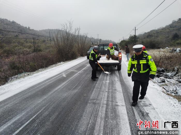 中新网广西新闻1月24日电(曾卫玲 吴高峰)1月21日清晨,寒潮裹挟着冰雪突袭广西桂林市全州县,501省道东山段、301省道才湾天湖段、241国道咸水洛江段一夜冰封,成为险途。全州县公安局迅速启动应急预案,交管大队联合才湾派出所、咸水派出所、公路养护中心等多方力量,顶风冒雪、分点作战,在冰雪中筑起一道道温暖而坚实的“平安防线”。