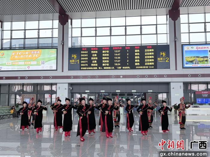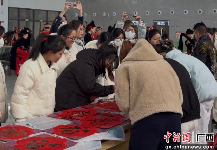 这是南凭高铁迎来开通运营后首个春运。为提升旅客出行体验,国铁南宁局南宁车务段联合龙州县文旅体广局、县书法协会,特意在龙州站策划了这场文化活动。候车旅客纷纷驻足,或静静欣赏歌舞,或排队参加义诊,有的还特意“点单”心仪的春联内容,现场洋溢着温馨与喜悦。