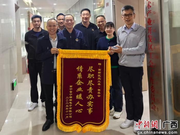 中新网广西新闻11月14日电 (欧阳钢桥 冯杰)11月14日,南宁富宁精密电子有限公司的企业代表专程前往南宁高新区办公大楼火炬大厦,将一面绣有“尽职尽责办实事情系企业暖人心”的鲜红锦旗郑重递交,以此向始终给予企业暖心关怀与高效支持的南宁高新区党工委、管委会领导和广大干部职工表达最诚挚的谢意。