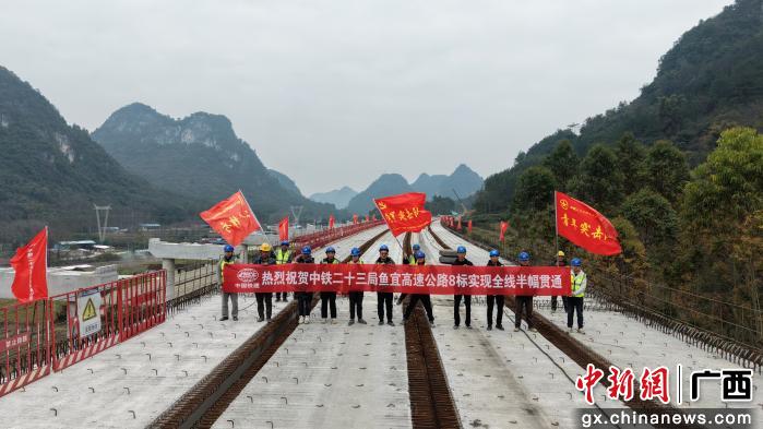 中新网广西新闻2月5日电 (苏玉伟)2月3日,随着里苗大桥左幅最后一片箱梁精准落位,由中铁二十三局集团有限公司承建的鱼宜高速公路8标顺利实现半幅贯通,为项目全线通车奠定坚实基础。