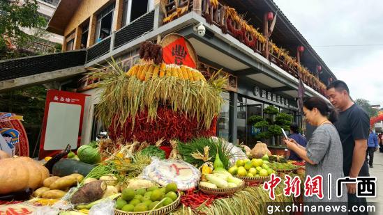 9月22日,游客在广西南丹县芒场镇,拍摄村民展示的丰收粮食和蔬菜。高东风摄
