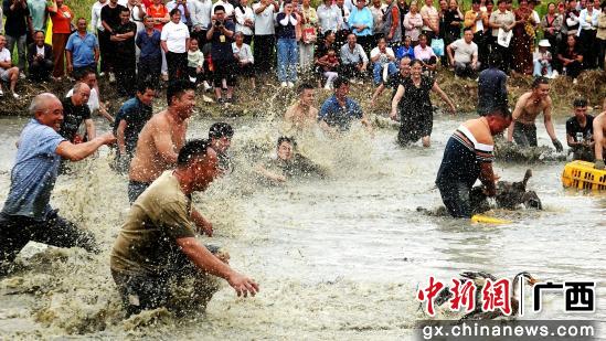 9月22日,广西南丹县芒场镇巴平村丰收节活动,村民在徒手抓鸭。高东风摄