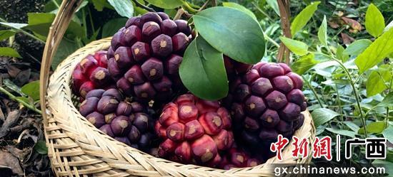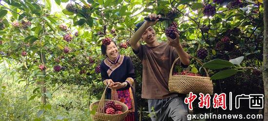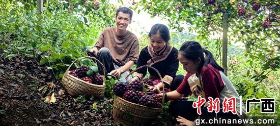 近日,广西桂林市恭城瑶族自治县三江乡安冲村的布福娜种植基地里,藤架之上,一个个紫红色、形似绣球的布福娜果实掩映在绿叶之下,缀满了枝头。村民们正忙碌着采摘、包装、发货。布福娜,又被当地民众称为“黑老虎”,果肉细腻、味甜似荔枝、汁水丰盈,是集食用、药用、绿化、观赏于一体的植物。