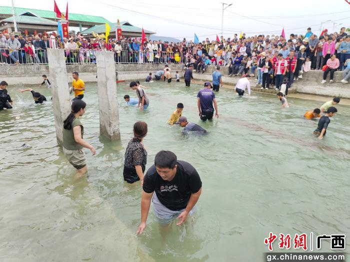 抓鱼比赛中,随着裁判一声令下,参赛村民们迅速踏入水塘,有的村民紧盯水面,待鱼儿游过便快速伸手去抓;有的则与同伴分工合作,一人在前方驱赶,一人在后方围堵;还有人不慎脚下打滑,溅起一身水花,引得岸边观众哈哈大笑。水塘里,鱼儿穿梭、人影晃动;水塘边,加油声、欢呼声此起彼伏,热闹非凡。