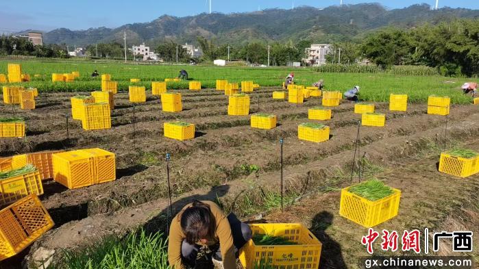中新网广西新闻11月10日电(彭伟成 杨光登 何坚勇)近日,广西北流市新荣镇五常村韭菜种植基地一片繁忙,农户们有条不紊地收割、分拣、打包新鲜韭菜,空气中弥漫着新鲜的韭香。这是该基地鲜韭菜今年第一次收割上市,奏响了当地冬季农户增收致富的乡村振兴新乐章。