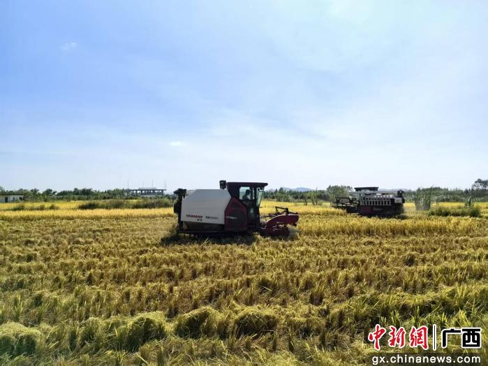 中新网广西新闻11月12日电 (温英迪)金秋时节,稻浪翻滚,南宁市江南区苏圩镇万亩良田迎来丰收季。收割机轰鸣不绝,金黄稻穗颗粒归仓,映照出“粮仓满、人心安”的喜悦图景。在这背后,是驻苏圩镇各级人大代表扎根田间、履职尽责的生动实践。