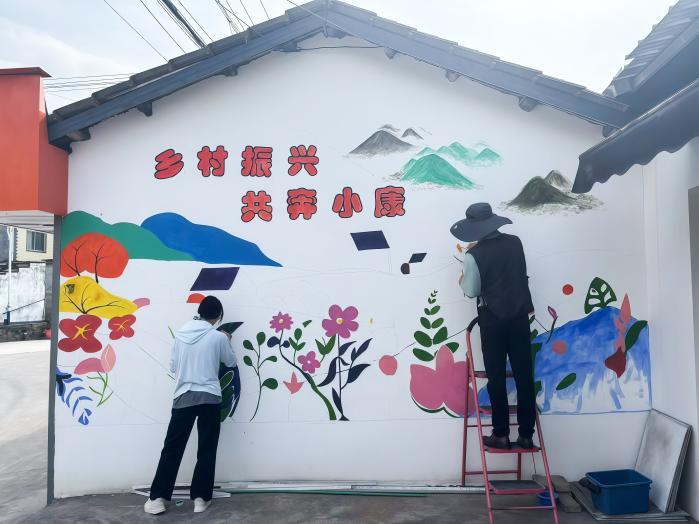 针对小店外墙单调的问题,帮扶小队买来颜料刷新墙面,结合罗田村的田园风光和特色,拿起画笔当起“乡村画师”。一面墙上以桂林山水为主题,用明亮鲜艳的颜色勾勒出层叠山水与田园村落的乡村振兴图;另一面墙上画上了紧跟潮流、萌趣活泼的动物形象,让小店内外焕发乡村气息与活力。