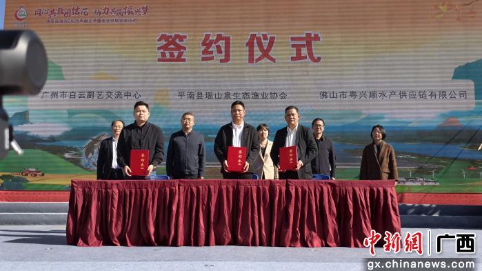 活动现场,一场合作签约仪式备受瞩目。平南县瑶山泉渔业生态有限公司与广州、佛山的两家企业签署协议,标志着“山泉鱼”正式开启直通粤港澳大湾区市场的崭新旅程。