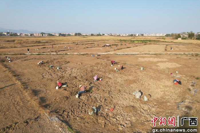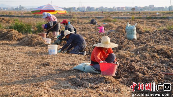 中新网广西新闻1月12日电(陆宏夏 陆远培 韦俏燕)眼下正值马蹄收获季。广西贵港市港北区抓紧时机,组织村民集中开挖和采收,确保农业增产,农民增收。