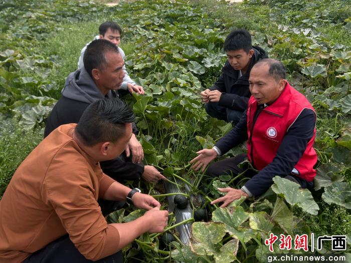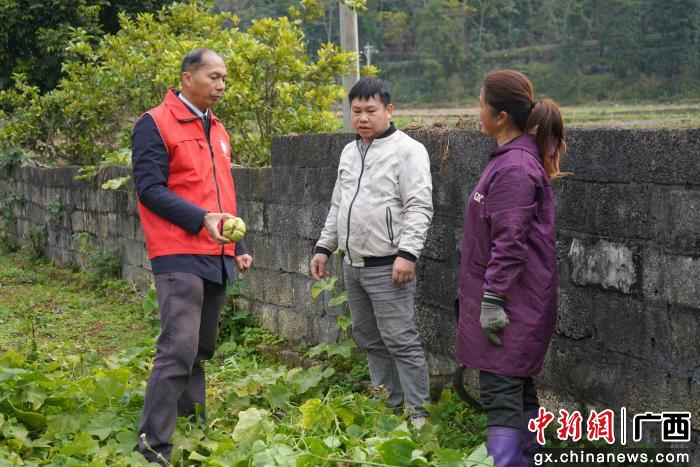 中新网广西新闻1月14日电 (刘瑾)为防范低温冻害影响果蔬生长,为农户增产增收护航,近日,广西大学农学院教师、广西乡村科技特派员、广西蔬菜产业先锋队副队长唐小付带领研究生一行,前往南宁市马山县,到田间观测果苗生长情况,为当地蔬菜种植户预防低温冻害提供技术指导。