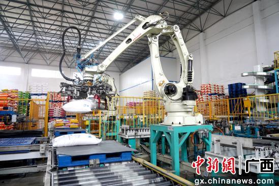 在公司的仓库,两个机械手稳稳抓起传送带上的米袋,按照预设程序逐层码放到货架指定位置,动作连贯流畅。工作人员只需操作智能叉车,便能将码放整齐的米袋批量运至货车旁,整个仓储、转运环节看不到传统人工搬卸的忙碌景象。