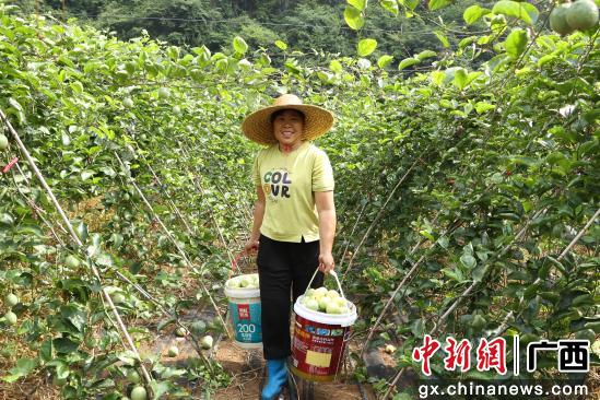 中新网广西新闻8月15日电(牙春柳)近日,在广西柳州市柳江区里高镇板六村兴龙屯,柳州市天泽谷韵种养专业合作社的种植基地里,连片百香果藤蔓上缀满诱人果实。工人穿梭其间,指尖轻捻,采果、分拣,筐筐金黄堆满田埂。