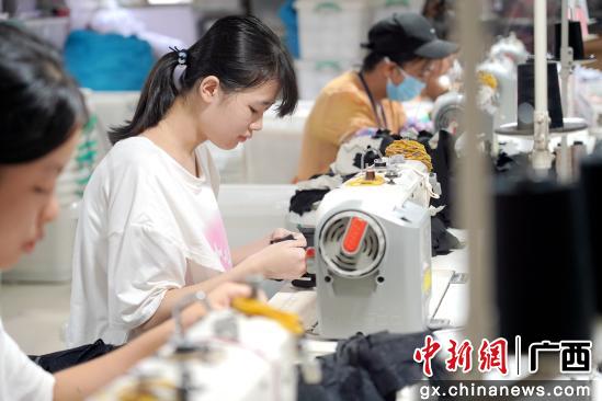中新网广西新闻8月15日电 (陆宏夏 谢海兵)近日,在广西贵港市港北区的广西益嘉发服装实业有限公司生产车间,工人们或低头专注裁剪布料,或熟练地操作着机器。经过剪裁、缝制等多道工序,一件件衣物成形下线。