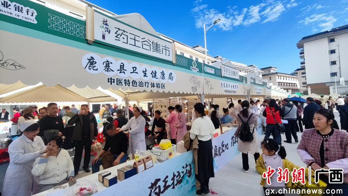当日,鹿寨县拉沟乡举办第四届药王节,热闹的药王谷集市吸引众多市民和游客前来选购原生态的中药材。(完)