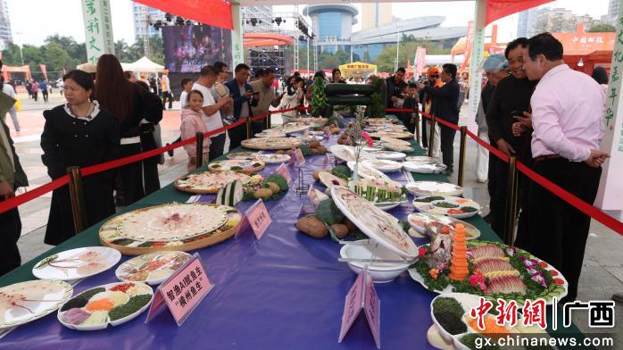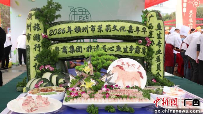 当日,横州市茉莉花文化广场上洋溢着浓厚节日气氛。在非遗美食展区,由15个参赛队伍同台竞技的“非遗美食巅峰对决·鱼生争霸赛”吸引了里三层外三层的观众。参赛队员们精湛绝伦的刀工与融合现代美学的创意摆盘相映成趣。