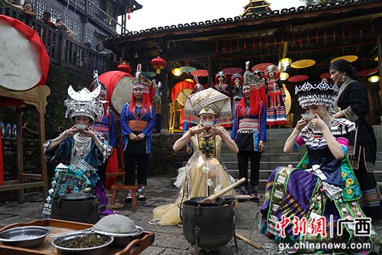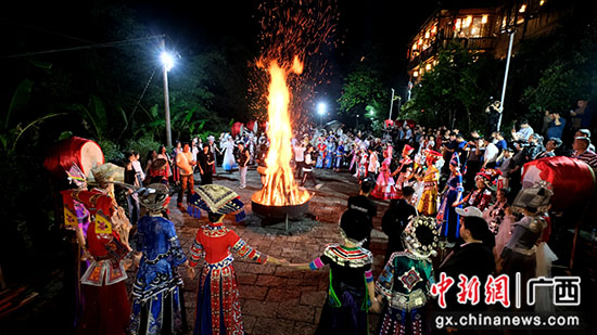 中新网广西新闻4月24日电(黄菲 唐鑫海 彭胜发)4月21日晚,在广西桂林市临桂区宛田瑶族乡4A级景区在水一汸,坐落于深山中的中国传统古村落——宛田瑶族乡东宅江村热闹非凡,12位世界旅游小姐、26位“桂花仙子”来到这里,与游客们和当地民众共庆“三月三”,感受瑶乡风情。