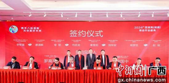 近日,以“携手八桂湘商·共创美好未来”为主题的2024广西湖南(湘商)商会年会在南宁市举行。广西湖南(湘商)商会各地市湖南商会代表、各省在桂商会代表共400多人参加本次年会,并对做出贡献的志愿者、会员及湘商个人或团体进行表彰,同时携手企业与多家公司进行现场签约,助推广西经济建设发展。