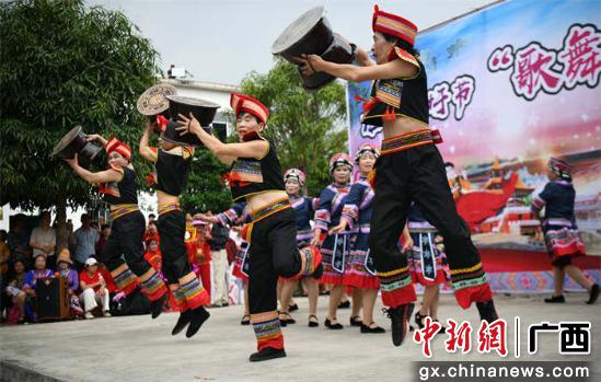 4月12日,群众在大化龙口歌圩节歌舞同行大战舞台上表演《铜鼓舞》。韦哲 摄