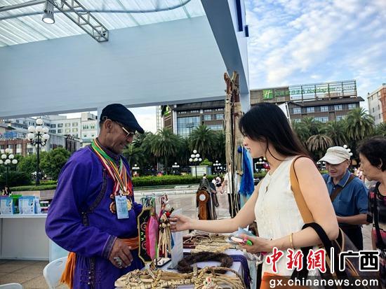 8月22日,“鄂尔多斯文化神州行”参展商向桂林市民介绍特色手工织品。邓竣缤 摄