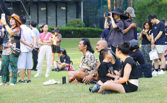 中外游客、民众在草坪上享受音乐节。刘周雯 摄