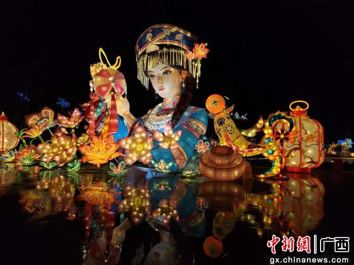 本次嘉年华核心的花灯展,由四川自贡花灯非遗团队匠心打磨,共推出“天马降福”“邕城春禧”“壮乡儿女”等近40组造型鲜活、寓意吉祥的主题灯组。9.5万平方米园区内光影流转,山顶30米巨型灯组气势恢宏,与湖面灯影交相辉映,一步一景,营造出如梦如幻又喜庆祥和的视觉体验。