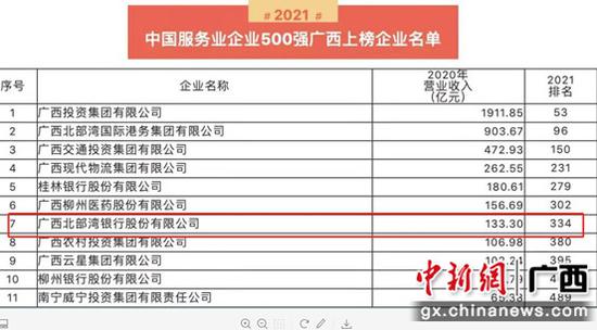 - 广西北部湾银行连续10年名列中国服务业企业500强