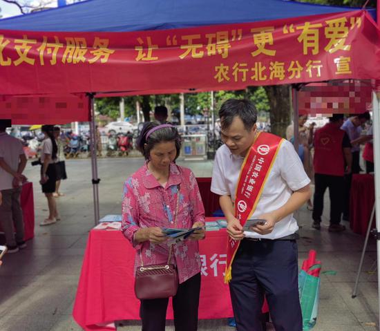 农行广西北海分行围绕“优化支付服务 让‘无碍’更‘有爱’”主题,向过往游客讲解优化支付服务政策。农行广西分行供图