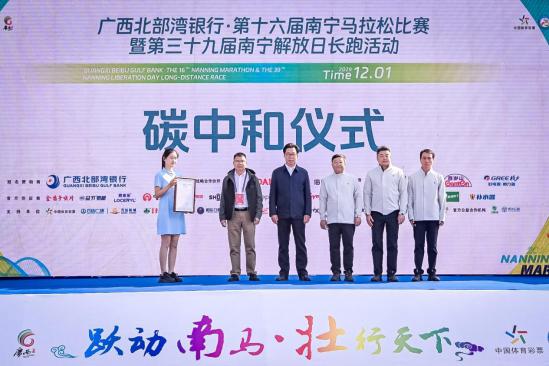 为倡导绿色低碳生产生活方式,广西北部湾银行与活动主办方合作,将本次马拉松比赛活动办成一届碳中和的体育赛事。广西北部湾银行助力活动主办方科学制定了活动碳中和实施计划,优先实施了温室气体减排措施,对本次活动排放的996.69吨二氧化碳当量温室气体,由北行通过购买广西首批发行的林业碳票项目——河池市环江毛南族自治县华山林场(一期)林业碳票项目碳减排量1050吨,捐赠给本次活动主办方用于抵消本次活动产生的温室气体,达成广西大型体育赛事的首次“碳中和”。