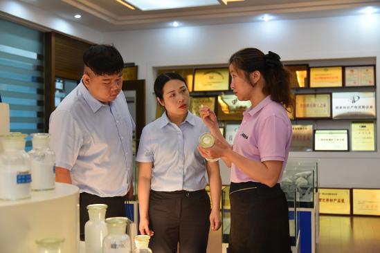 图为农行客户经理走进贺州市科隆粉体有限公司了解产品生产销售情况与金融需求。陈煜萍 摄