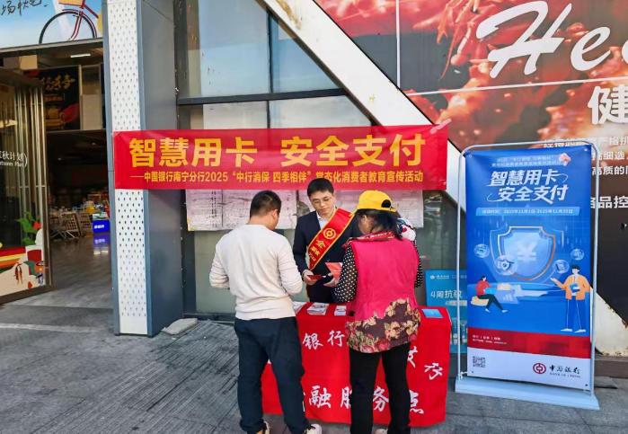 中国银行广西区分行近日在全辖内积极开展“智慧用卡 安全支付”专项教育宣传活动,222家网点共行动,线上线下相呼应,围绕安全合规用卡、理性消费、远离非法金融活动等核心要点开展全方位宣传,助力消费者正确认识金融产品和服务,提升金融素养,维护金融安全稳定。