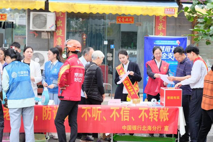 中行辖属北海分行联合社区深入居民小区开展金融宣传活动。活动现场,银行宣传志愿者在小区人流密集区域搭建宣传摊位,向居民发放定制化宣传折页,详细列明非法金融活动的常见特征、识别方法及举报渠道,手把手指导居民下载国家反诈中心APP,提醒大家遇到可疑金融活动时保持警惕,及时与银行或警方沟通核实,切勿轻易转账汇款。