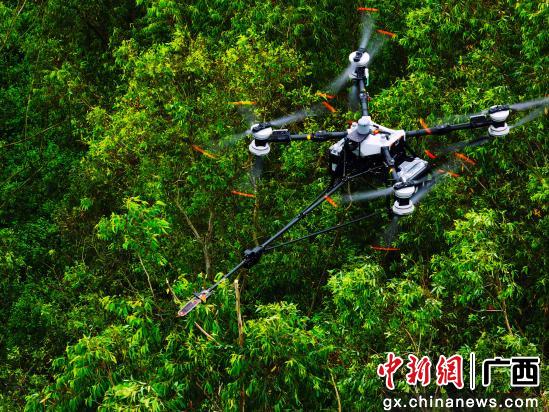 中新网广西新闻9月10日电 (曾远 罗仁科)9月8日至9日,崇左扶绥县东门林场35千伏德科线输电线路旁,南方电网广西崇左供电局技术人员通过精准操控一台多旋翼重载无人机,用电锯完成高危枝条的修剪作业。据悉,这是该智能化清障技术在崇左输电线路运维中首次应用。